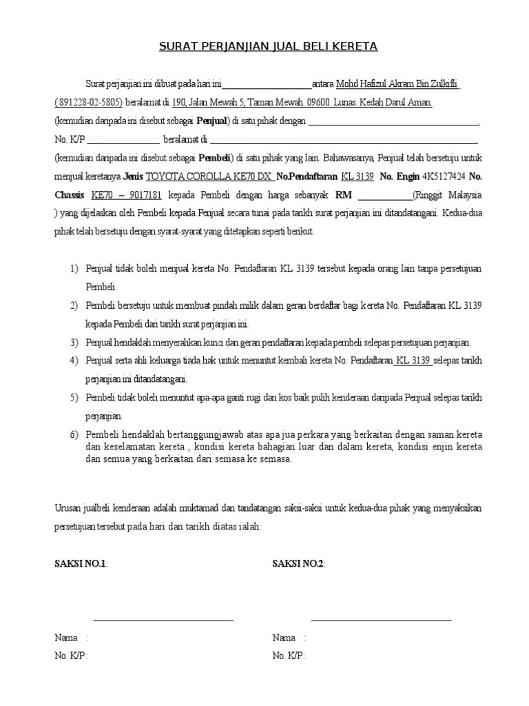 Bahawasanya surat perjanjian ini diperbuat pada 31 mac 2013 (ahad) antaraa. Apa itu surat perjanjian jual beli kereta? Surat perjanjian jual beli kereta. Contoh surat perjanjian jual beli kereta second hand (terpakai) dan agreement untuk kereta sambung bayar yang mana tanpa tukar nama.
