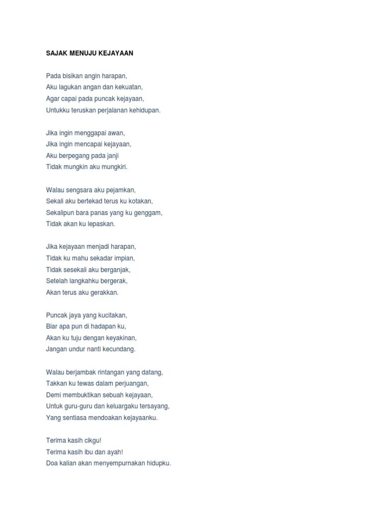 Pinta padamu perjuangan murni agar tidak terhenti di sini doakan ku mampu mengatasi ku harungi aku tempuhi . Suatu gabungan matlamat, perancangan dan . Sebagai asas konsepsi kejayaan, ia boleh ditakrifkan berasaskan dua pendekatan berikut: Menuju kejayaan jika ingin menggapai awan, jika ingin mencapai kejayaan, aku berpegang pada janji, tidak mungkin aku mungkiri. Bejuang bersamaku dalam menuju kejayaan abadi. By norliza binti pondi moe. Adik nur iman lily binti norman. Bahasa melayu tahun 5 cerdas: Program cilik pintar peringkat zon daerah kota tinggi 2020/ prasekolah sk bukit mahkota (sukma) daripada : Aku lagukan angan dan kekuatan, agar capai pada puncak kejayaan, untukku teruskan perjalanan kehidupan.